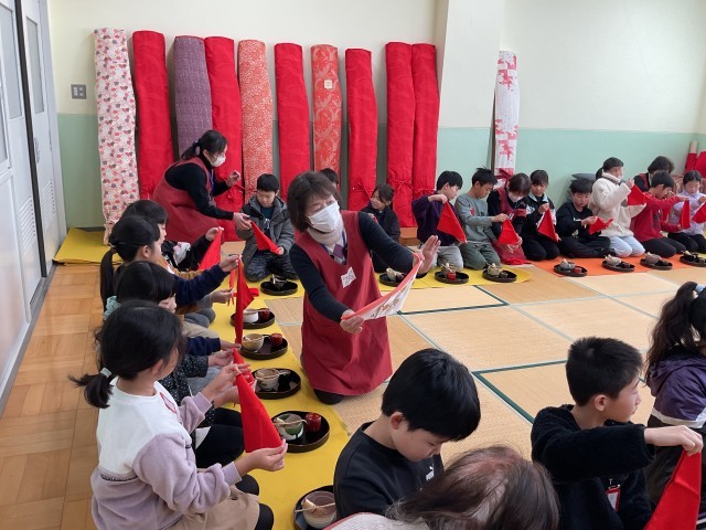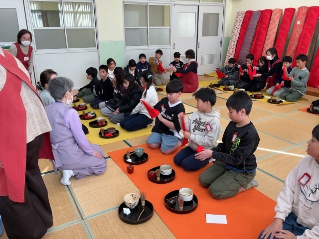 21日(水)23日(金)に茶道体験がありました。まずは、女性会の方に茶道に使う道具について教えていただきました。知らない名前のものや、使ったことのないものばかり…。みんな興味津々です。