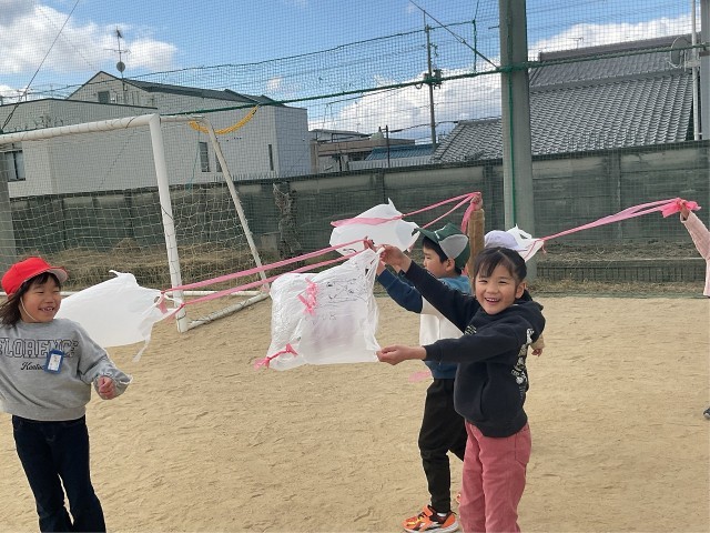 今日は外が温かく、過ごしやすい気候でした。生活科の学習で風を使って遊ぶことができるのか考えました。そこでオリジナルの簡易凧を作りました。みんな楽しくて走り回っていましたが、次第に風の向きに合わせて凧を操作することが大切だと気づくことができました。
