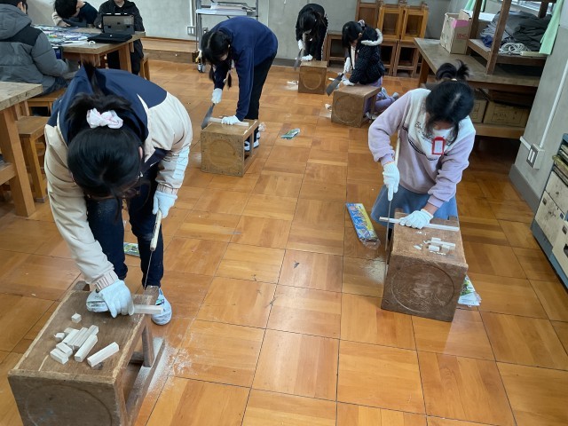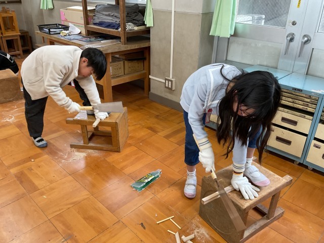 図画工作科で初めてのこぎりを使いました。安全に気を付けて頑張っています。だんだん慣れてきたら、たくさんの木材を切れる子も増えてきました。