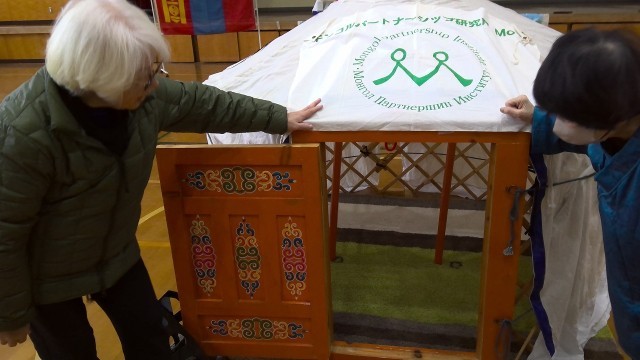 モンゴルの文化的移動式住居である,ゲルを見せていただきました。ゲルの中にも入らせていただき,中の様子も体験することが出来ました。「暖かいな!」「模様のような絵が描かれている!」など,色々な発見がありました。
