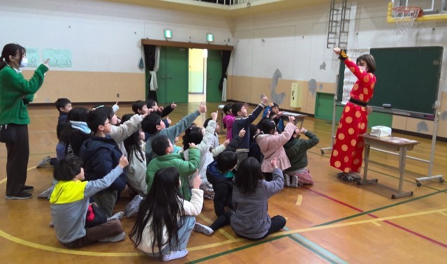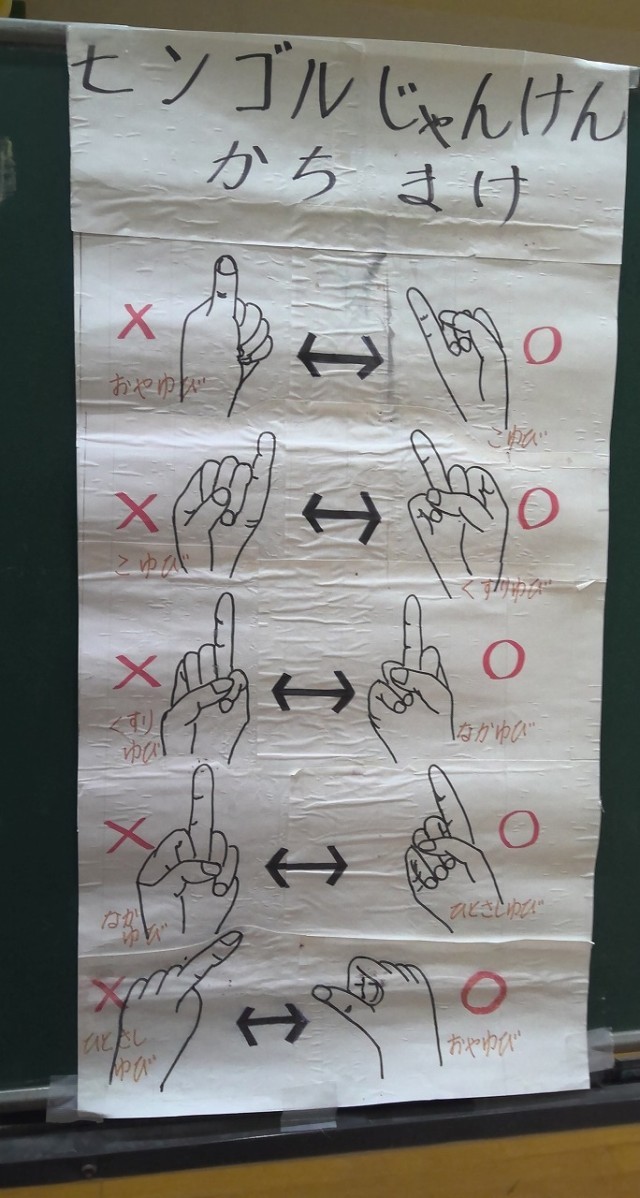 モンゴルの生活文化の体験ということで,モンゴルのじゃんけんを体験しました。「日本と違う!」という声もある中,モンゴルならではのじゃんけんを楽しみました。モンゴルで使われているお金を見せていただいたり,簡単なモンゴル語の本を見たりと,子どもたちは楽しそうにお話を聞いていました。モンゴルの簡単な挨拶を覚え,お友達どうして伝え合う姿も見られました。