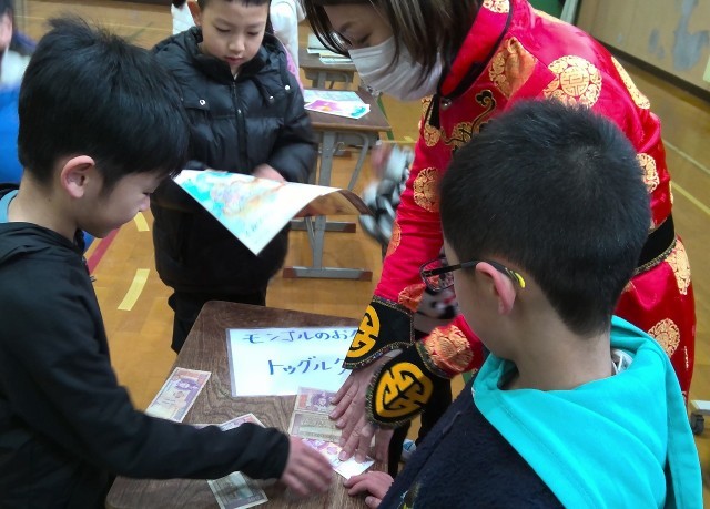 国語の「スーホの白い馬」の学習に繋がる,モンゴルの文化体験学習がありました。講師の先生にモンゴルの文化について説明していただき,それぞれのブースに分かれて体験活動を行いました。珍しい楽器や住居,お金や本など,子どもたちは興味津々でした。学びのある,素敵な体験が出来た時間でした。