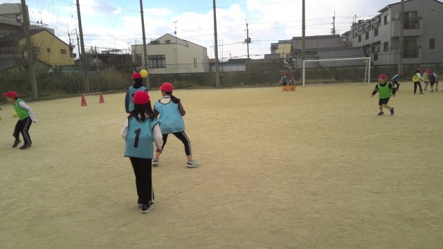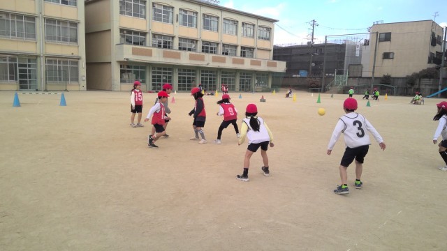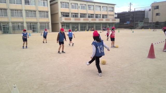 寒い中ですが、子どもたちは元気に「サッカー」の学習に取り組んでいます。コートの準備、準備体操をした後にパス練習をします。「インサイドキック」「インステップキック」「トラップ」など、2~3人組で練習します。動きながらパスしていくのでしっかり練習をしています。その後の試合では、うまくパス回ししてシュートに繋げられるチームも出てきています。