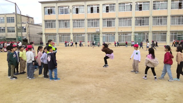 本日の中間休みの時間に大なわ大会がありました。クラスごとに声を掛け合いながら応援し,一生懸命頑張りました。本番で緊張する中でも,練習の成果を出し,沢山跳ぶことが出来ていました。一人ひとりが息を合わせ,目標に向かって頑張る姿が見られました。