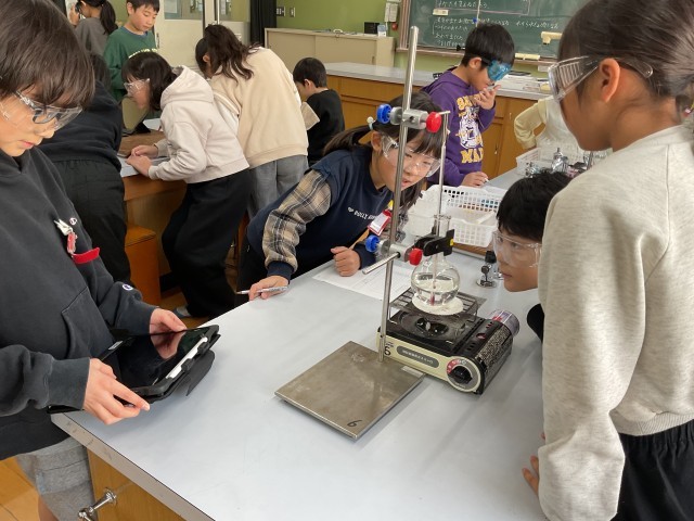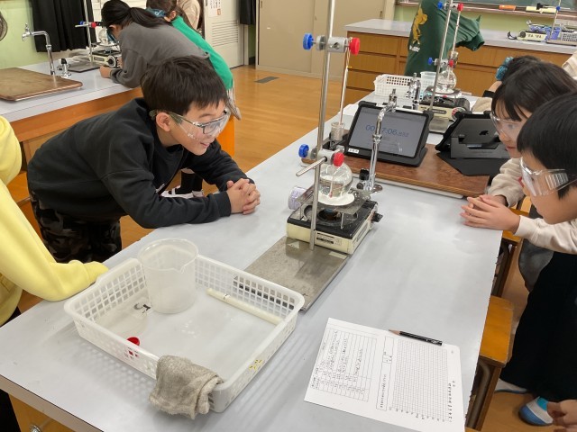 水を熱し続けるとどうなるのかの実験をしました。記録をとりながら、「どんどん温度が上がる!」「あわがたくさん出てきたよ!」「あわの大きさも変わってきた!」と大盛り上がりでした。でも…「100℃近くになると、大きなあわがたくさん出てくるけれど、温度が上がらない」ことに、実験で気がつきました。