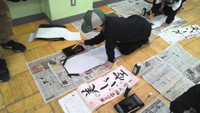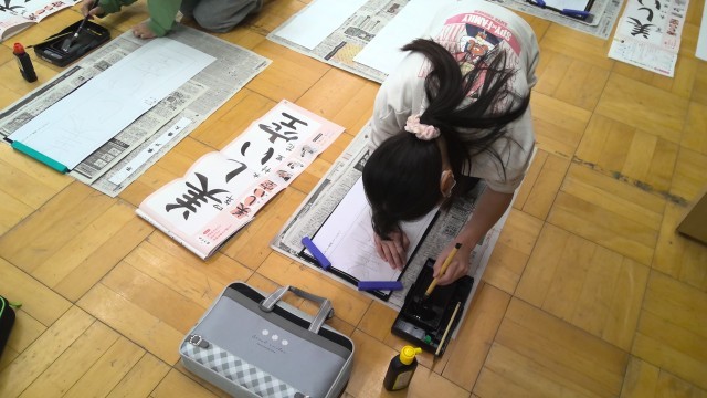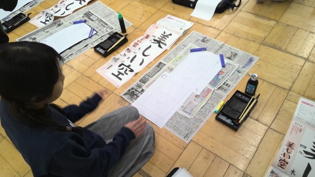 今日は書写の学習で「美しい空」の書初めをしました。文字の大きさに気をつけて、字形を整えて書くのを意識していました。いつもの書写で使っている半紙とは大きさも違いましたが、書き方も工夫しながら書いている様子でした。