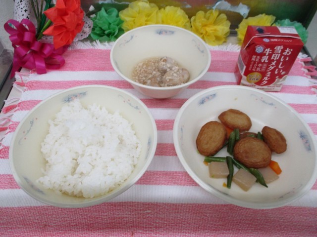 2月4日(水)の給食は、ごはん、牛乳、平天の煮つけ、揚げ里いものあんかけでした。