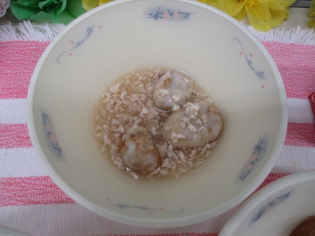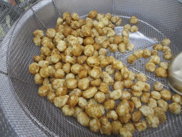 揚げ里いものあんかけは、里いもを昆布だしで炊いてしょうゆなどで下味をつけた後、米粉をまぶして油で揚げます。やわらかくなった里いもが崩れないように丁寧に揚げくださいました。子どもたちは教室でかつおだしがきいたそぼろあんをかけて食べます。
