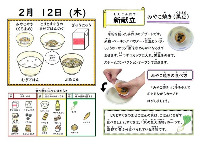 2月12日(木)の献立は、麦ごはん、牛乳、とりとずぐきのまぜごはん(具)、豚汁、みやこ焼き(黒豆)でした。