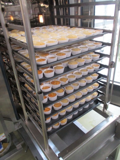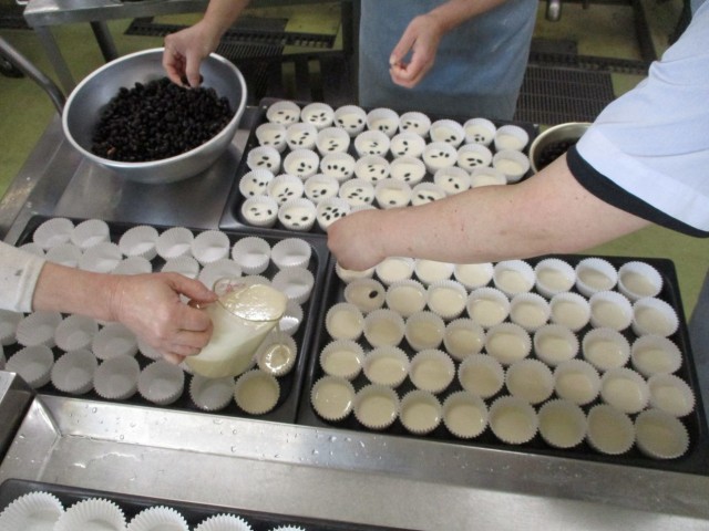 米粉、三温糖、しょうゆ、ベーキングパウダー、サラダ油で作った生地をカップに流し込み、蒸し黒豆を乗せてスチコンで焼きました。