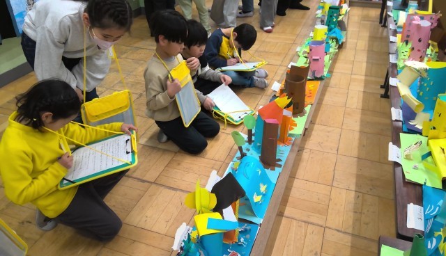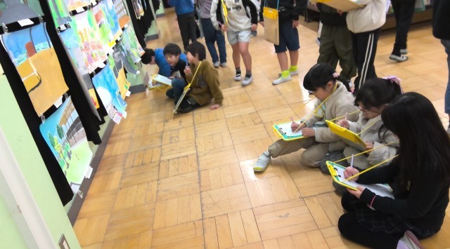図工の鑑賞の学習で,図工展にいきました。図工展では,平面や立体の様々な作品が沢山あり,それぞれの学年や学級の個性が出ていて,とても素敵な世界が広がっていました。2年生は,他学年の作品を見ながら,迫力があって凄いな,こんな風に絵を描いてみたいな,どうやって作っているんだろうと,興味を持って色々な作品を見ていました。これからの図工の学習の学びに,繋がっていったのではないかと思います。