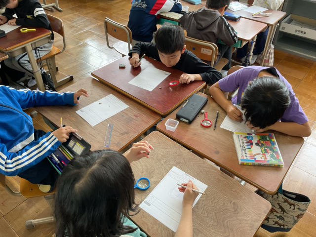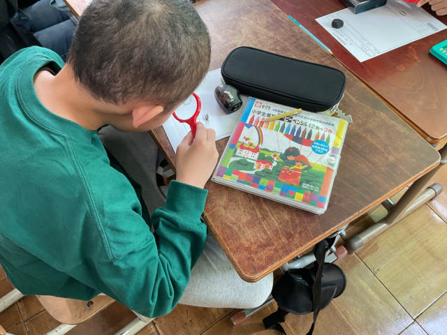 虫めがねを使い、細かいところまでじっくり観察しています。