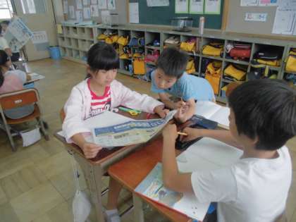 国語は今日から「新聞を作ろう」の学習に入りました。まずは新聞の特徴をつかむために、「読み手にわかりやすく伝えるための工夫を見つけよう」と子ども新聞を実際にながめて、グループごとに取り組みました。見つけられたたくさんの工夫を実際の新聞づくりの中で使っていくことをめあてに進めていこうと思います。