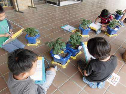 ミニトマトの苗がどんどん生長し,黄色い花が咲き始めました。観察の視点は,「前よりも変化のあった部分を見つける。」です。子どもたちは,スケッチをするときに,全体の絵を描いてしまいがちです。そのため,変化のあった部分を見落としてしまいます。指導者の一言で,どこを見たらいいのかがわかってくるようです。次は,小さな実を発見できるといいなと思います。