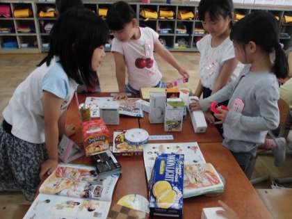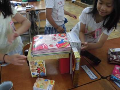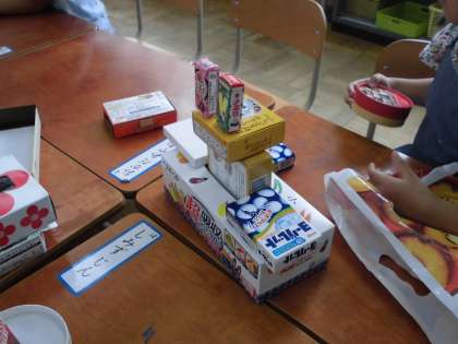 今日は,みんながお家から持ってきた空き箱や空き缶で,色々な形を作る活動を楽しみました。グループで考えを出し合って,動物や乗り物などを楽しんで作っていました。