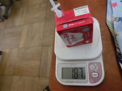 クラスには,牛乳の苦手な子がいる場合があります。その子が飲める手立てを考えました。家にあるスケールを持ってきて,目盛の読み方を教え,この目盛の数字が減るとどれだけ飲んだかわかるよと教えました。