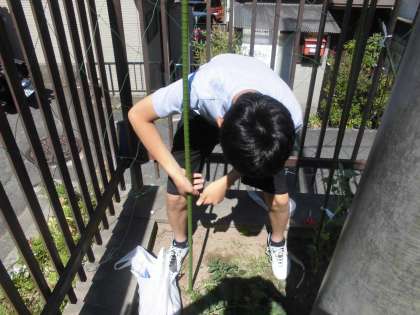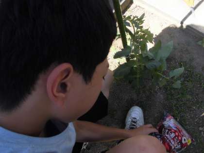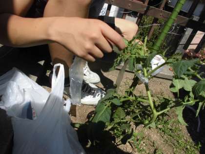 今日の1時間目にトマトが生長してきたので,支柱を立てました。支柱を土にさして,支柱と茎をひもで8の字で結んで固定しました。また,野菜に栄養を与えるために肥料をまきました。