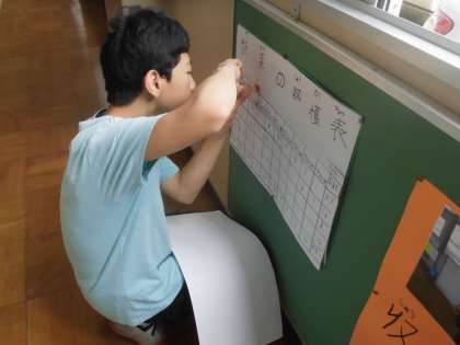 今日までに,89こ(本)も野菜が収穫できました。毎日しっかりと世話をした成果がしっかりと結果につながっています。収穫表も枠の長さをしっかりと定規で測って,手際よく作成しました。