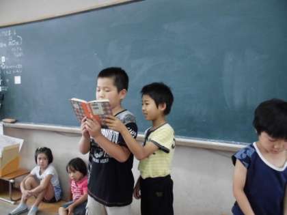 係の子が,「皆さんは,この詩をあまり読んだことがないと思いますので,初めに詩を読みます。次に,一か所変えて読むので,間違い見つけをしてください。」と説明した後にみんな真剣に間違い見つけをしていました。