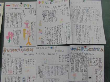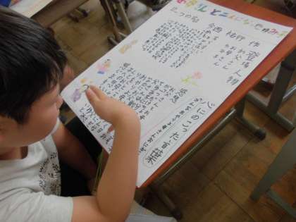 「一つの花」の学習のまとめとして、紹介ポスターに取り組んでいます。「あらすじ」「心に残った文」「感想」などを書きまとめた最後に、キャッチコピーを決めるのですがこれが難関です。自分の思いに合う表現がなかなか浮かばずに頭をひねる子達も多いですが、何回か書き直すにつれて、自分で納得のいくものができてきています。