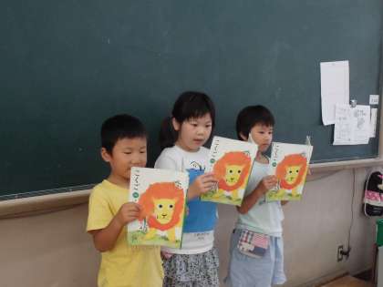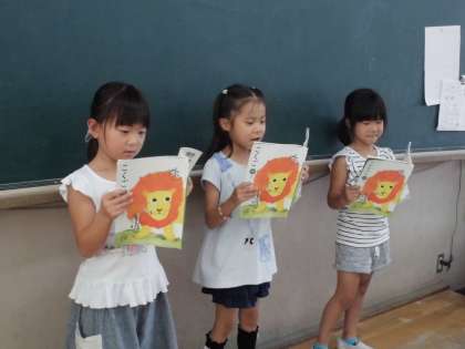 夏休みまであと少しとなりました。今日は,国語の時間に学習した「おおきなかぶ」の音読発表会をしました。グループで話し合って,一人で読むところ,みんなで読むところなどを決めました。動作を入れて読んでいるグループもありました。どのグループも大きな声で元気よくがんばって読むことができました。