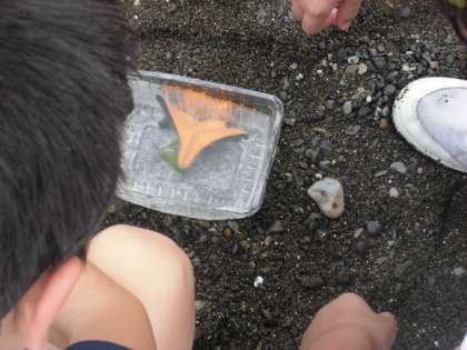 イトマキヒトデを手で触ったり,裏返しにしたりして徐々に元通りの表に向く様子を観察しました。