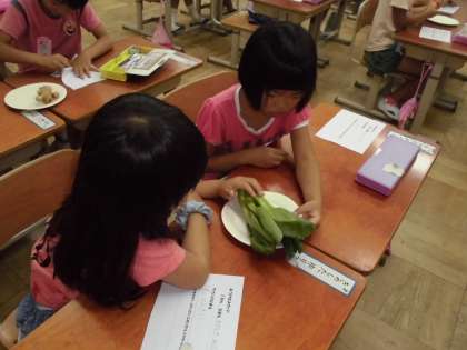 給食に入っていた野菜を思い出し,にんじん・ちんげんさい・もやしなど,いろんな野菜を五感を使って実感しました。野菜が体の中で大切な働きをしていることを知り,好き嫌いしないで食べることの大切さを学びました。