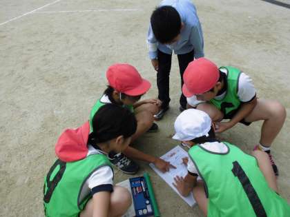 今週から体育は「リレー学習」です。まずは自分たちのチームのベストオーダーを見つけようと、レースごとに走順を並び替えてタイムを計っています。そしてそのタイムを左右するのが、何よりもバトンパスというわけで、各チームバトンパスの練習もがんばっています。