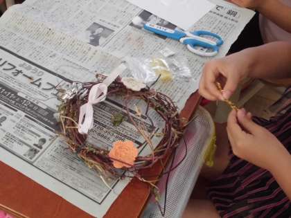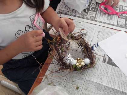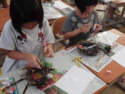 今日の3.4時間目に「あさがお」のつるで作った,リースのかざりつけをしました。家からもってきたかざりや,学校で用意したかざりなどで楽しみながらか作りました。どれも素敵なリースに仕上がりました。