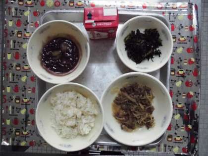 1月15日の給食は,いもぜんざい,小松菜とひじきの炒め物,牛丼の具,麦ご飯,牛乳です。