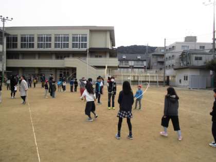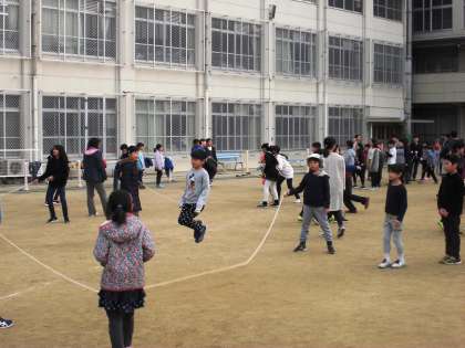 現在朝ランニングの時間に縦割りグループのメンバーで,大縄跳びに取り組んでいます。