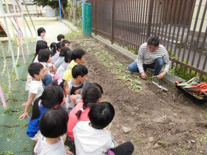 先週みんなで草抜きをして、準備をしていた畑にサツマイモの植え付けをしました。秋には収穫したおいもを使ってサツマイモパーティーを開き、1年生を招待するという大きな目標がかかっています!松井管理用務員さんに植え方のこつを教えていただきながら、一人一本ずつていねいに植えつけました。明日から水やりをがんばろう!