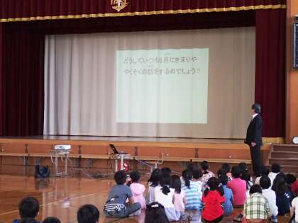 校歌斉唱の後,「どうして5月にきまりや約束の話をするのでしょう?」と投げかけ,「5月3日が憲法記念日で日本国憲法ができたことをお祝いする日」と話しました。