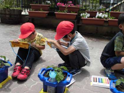 生活科の学習で育てている「あさがお」です。本葉が増えてきたのでまびきしました。「葉っぱをさわると,ざらざらする」と発見していました。よく見て観察カードを書いています。