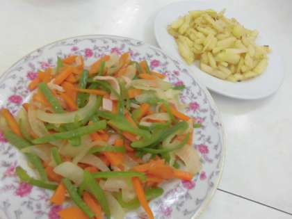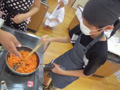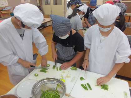 家庭科の調理実習で、炒めて作れて栄養バランスも良い「野菜のいろどりいため」と「じゃがいもいため」を調理しました。
