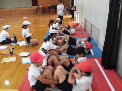 握力・上体起こし・長座体前屈・反復横とび・立ち幅とび・ソフトボール投げをグループごとに回っていきました。