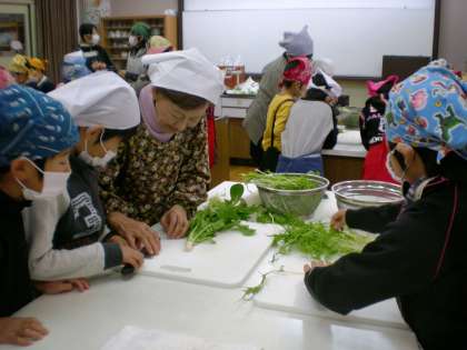 稲荷女性会の主催で2年生の子どもたちが一緒に七草がゆを作りました。まず、七草(セリ・ナズナ・ゴギョウ・ハコベラ・ホトケノザ・スズナ・スズシロ)の紹介と七草がゆの由来を教えていただきました。そのあと、一緒に七草を切っておかゆを作りました。出来上がった七草がゆをみんなでおいしくいただきました。「包丁で切るのが楽しかった。」「おいしく食べました。」など女性会の人に感想とお礼を言って終わりました。