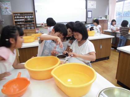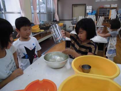 今日から、算数は「かさ」の学習です。今日はまず「1L」の単位を知り、身近な入れ物のかさを1Lますで調べるという活動に取り組みました。3つの入れ物のかさを見た感じで予想してから、確かめました。終わったあとにたずねてみると、「思っていたより、1Lの量は多かった!」という感想をもった子が圧倒的に多かったです。つぎの時間には、「リットル」と「デシリットル」の関係を確かめていきます。