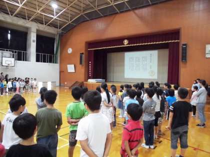 全校児童で稲荷小学校校歌斉唱し,続いて「世界中の子どもたち」を元気に歌いました。