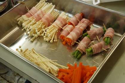 おかずは当日の給食メニューにあった「にしんのにつけ」「だいこんばのおかかいため」に,グループで選んで作った「野菜のベーコン巻」「ジャーマンポテト」を加えました。