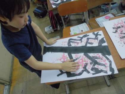 墨と指で桜をえがこう
