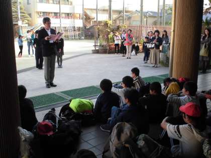 たくさんのお出迎えの中で,修学旅行の振り返りをしました。