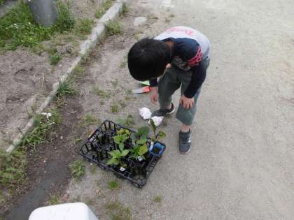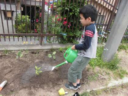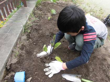 先週の木曜日に,畑にナスとピーマンを植えました。これから毎日,水やりをして,立派な野菜をやおやさんに売りたいですね。