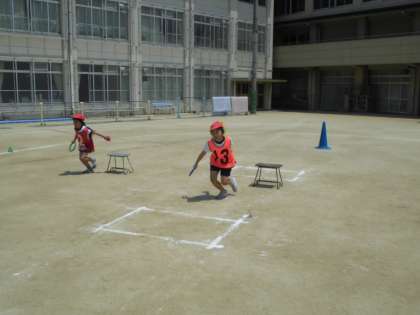 体育の学習でリレー遊びをしています。置き換えリレーや折返しリレーをしていますチームで走る順番やバトンのわたし方を工夫しながら,みんな頑張って走っています。大きな声で応援している姿が微笑ましいです。