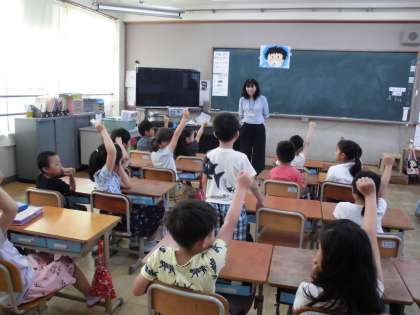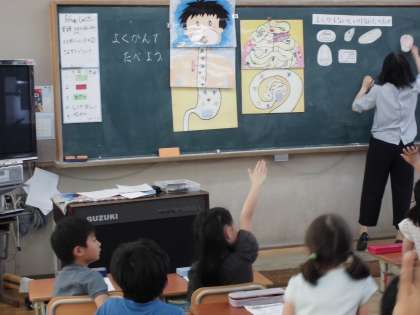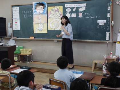 今日の4校時は,食の学習でした。栄養教諭の先生に「よくかんでたべよう」について教えていただきました。口の中にはいった食べ物が胃や腸を通っていくことや,よく噛んで食べることがなぜ大事なのかなどについて教えていただきました。口に入れた食べ物は30回は噛んで食べようと学習しました。今日の給食時間は,みんなしっかり噛んで食べていました。