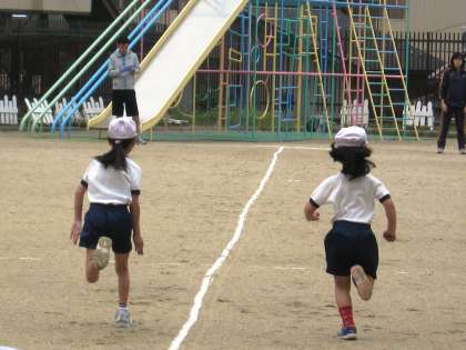 今日の2時間目、1・2年生合同で体育をしました。力いっぱい50メートルを走ろうというねらいで、それぞれの子どもたちが自分の持っている力をいっぱい出して走りました。まず、2年生が走り、1年生にお手本を示しました。1年生も負けずに50メートルをいっしょうけんめい走りました。一人一人タイムを計ってもらい、みんな自分の走りに満足していました。