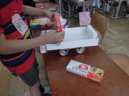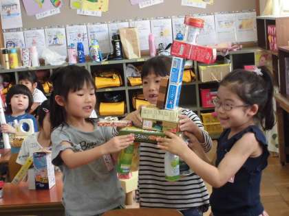 お家の方から色々と持たせてもらった空き箱や空き缶を使って,思い浮かぶものを作りました。細長い箱,大きな箱,筒形の箱,空き缶などの形の特徴をうまくいかして作品作りを楽しんでいました。最後はお互いに出来上がった作品を見せ合いました。みんなそれぞれに,自分なりの工夫がありました。