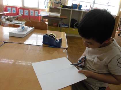 やおやさんにチャレンジの学習で,レジを作りました。画用紙を切って,切った画用紙を組み合わせて箱状にしてレジの形を作りました。箱のかどをセロテープでどのように貼ったらいいのかを自分で考えて貼っている姿が見られました。