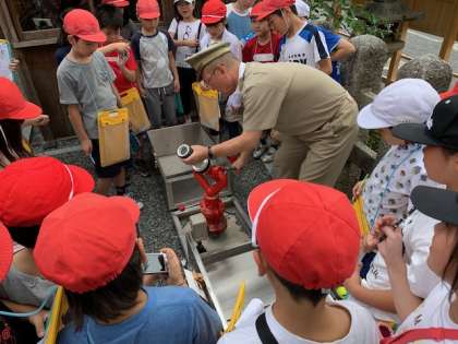 そして稲荷大社の中も探検していると,守衛さんが子どもたちの取材に応じてくださって,本殿の周りには「放水銃」という消火設備があって,みんなもビックリ!そして防犯カメラの集中モニターで,稲荷大社の安全を見守ってくださってることなどをお話いただきました。