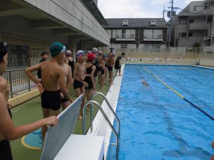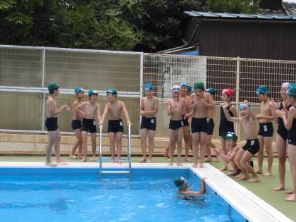 5,6年生の水泳学習はお天気にも恵まれ,今日で13時間目が終わりました。検定の時間にはタイムトライアルにも挑戦し,5年生から1人1級合格者が出ました!自分の目標の距離を泳ぎきった後の達成感は,格別だったようです。